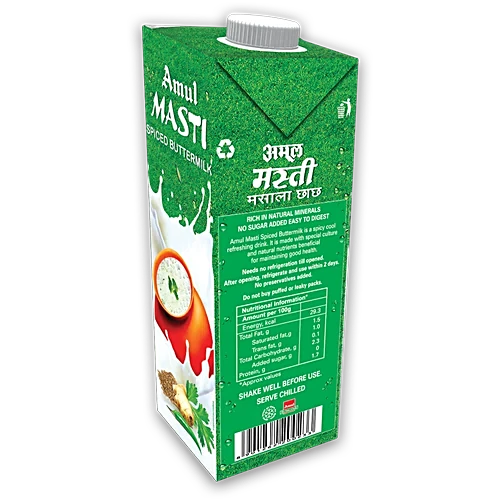 Amul Masti Buttermilk is refreshing milk based natural drink. It is an easy to use low calorie drink that refreshes you immediately with goodness of nature. To be taken directly on move (small pack) or at home, parties, picnics etc. (family pack). Tastes best when chilled.