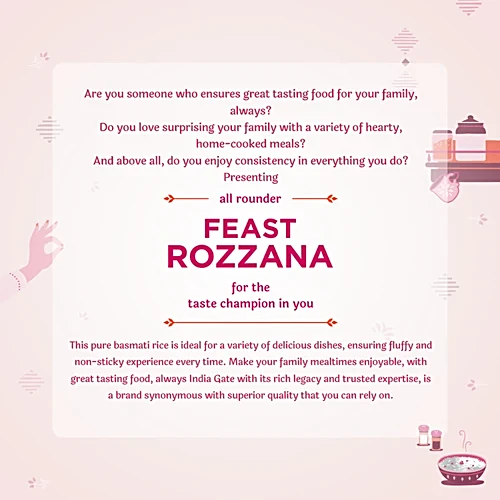Indulge in the exquisite taste and aroma of India Gate Feast Rozzana Basmati Rice, carefully selected and expertly aged for a delightful burst of flavours in every bite. Sourced from the foothills of the Himalayas, this premium-quality Basmati rice is renowned for its long, delicate grains, vibrant colour, and distinct fragrance that elevates every meal to a gourmet experience. Crafted to perfection, Feast Rozzana Basmati Rice is packed with essential nutrients and wholesome goodness, allowing it to effortlessly absorb flavours and result in dishes that are both aromatic and flavourful. Whether you’re preparing traditional Indian dishes or everyday meals, this versatile Basmati rice will be an essential part of your culinary journey, leaving you craving for more with every bite.